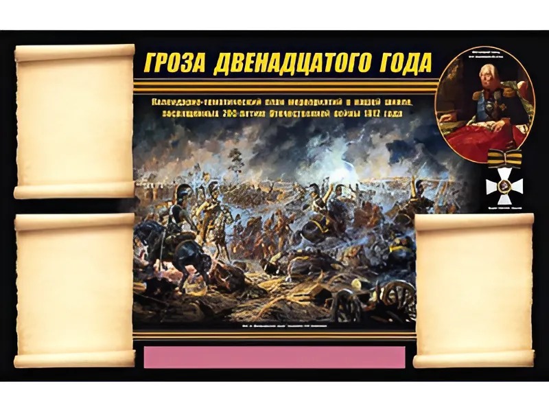 Стенд предназначен для размещения информации, посвященной Отечественной войне 1812 года. Может быть использован для оформления тематических выставок в школах, патриотических клубах, детских оздоровительных лагерях.