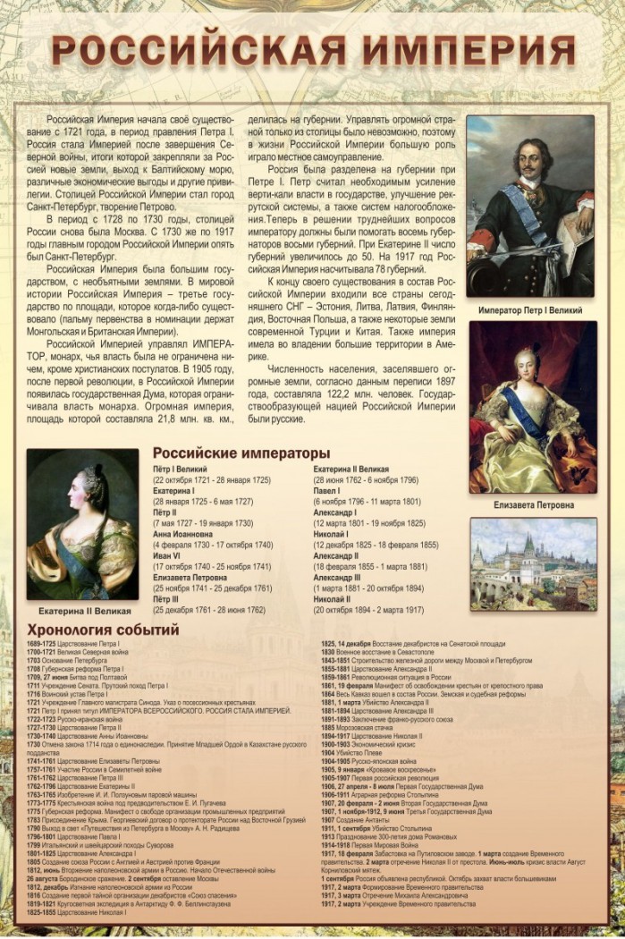 Обычно всем школьникам, становится намного интереснее изучать историю собственной страны, когда начинаются увлекательные времена, полные дворцовых интриг, мудрых императоров и роскошных императриц. А на этом стенде, школьники найдут нечто большее, чем хронология событий, прекрасные портреты и картину. Здесь есть так же перечисление всех российских императоров, с заветными датами. Ну и, наконец, наверху стенда, имеется интереснейший печатный текст, повествующий о самых волнующих фактах, связанных с Российской Империей. Ведь каждому ученику, как и преподавателю, прекрасно известно, что подача исторической информации очень важна. Именно поэтому, одни учебники интересно читать, а иные нет.