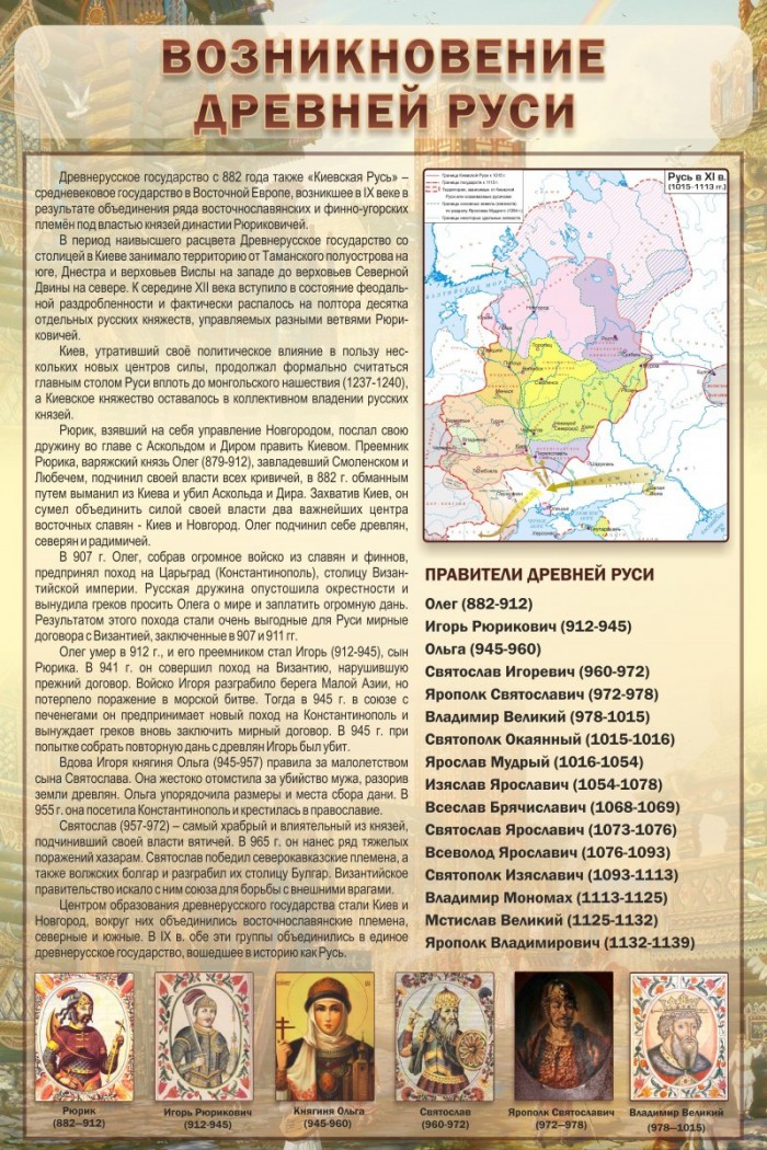 Стенд с портретами первых правителей, которые властвовали над всей Русью. Здесь и княгиня Ольга, и Святослав, и иные князья. Помимо этого, дана история возникновения Древней Руси, в очень лаконичном и интересном изложении. Прилагается карта и список правителей Древней Руси. С таким дизайном, в информации стенда не потеряться. Удобное расположение портретов, текста, карты и списка правителей под ней, не даст запутаться ни одному школьнику, даже на мгновение. Если уж и приобретать стенды для кабинета истории, то именно такие. Хоть карманов здесь и нет, но изложение, настолько увлекательное и подробное, что о кармашках не вспомнят даже преподаватели, которые ищут стенд с их наличием.