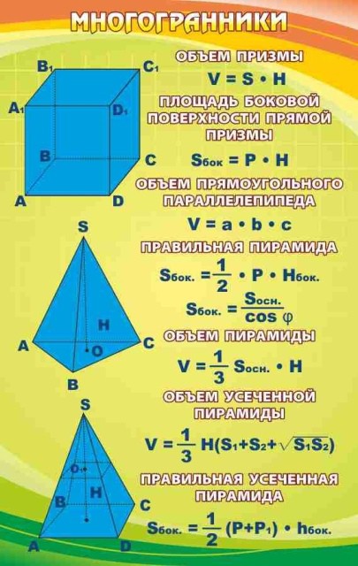 Тема, которая будет задействована, в какой-то степени, не только лишь на математике, но и на черчении. Стенд с многогранниками выполнен в безупречном сочетании яркого дизайна с четкой подачей необходимой темы. Сплошные формулы и красивые фигуры. Многим школьникам тема эта нравится больше всех остальных, хотя формулы сами, надо сказать, не совсем легкие. Но этот стенд позволит сделать реальностью мечту многих учителей, связанную с тем, чтобы максимально легко и доходчиво, объяснить сложную суть многогранников, их ученикам. Скорее всего, именно на таких уроках, многие школьники начинают мечтать о преподавательской деятельности, в будущем!