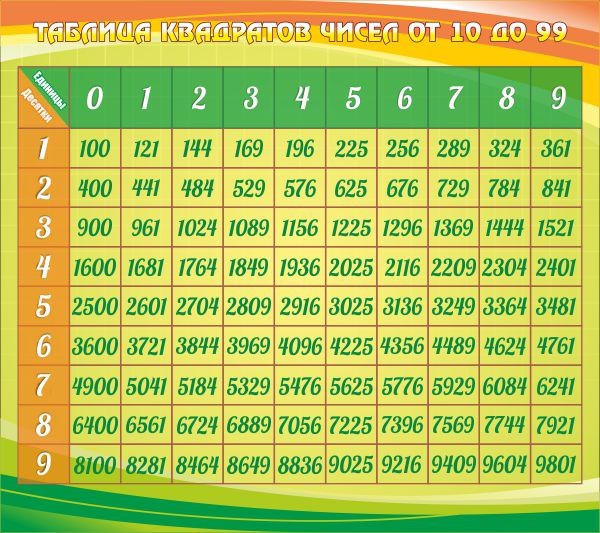 Многим учителям приходится смущенно улыбаться, когда ученики при проверках приемной комиссии, находят верный ответ на подобных стендах. Но, на самом деле, без таких табличек в оформлении математического кабинета, как ни крути, не обойтись. И поэтому, следует подумать о том, чтобы заказать в среднее учебное заведение, такой стенд. Кроме яркого дизайна, он может «похвастаться» тем, что на нем дана табличка квадратов всех чисел от десяти до девяноста девяти. Приятная расцветка стенда ничуть не будет сбивать внимание школьников. И может быть, кому-то удастся, в идеале выучить эту таблицу, наизусть. Бывают же гении математики или просто те, у кого с памятью все прекрасно.
