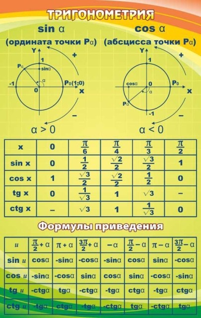Сложная тема тригонометрии, запомнится намного легче и быстрее, если в классе будет такой стенд. А, самое главное, ученики поймут данную тему, максимально скоро. Тангенсы и котангенсы, а также и косинусы с синусами, будут покорены, намного быстрее, при наличии в кабинете этого стенда. Сложные параболы и формулы приведения в доступной к пониманию школьников таблице, красуются на стенде, который ярким фоном, будет поднимать настроение, всему классу. Зря многие современные учителя и администрации средних учебных заведений, не понимают, что и от дизайна учебных стендов, зависит успех изучения школьниками, тех или иных тем.