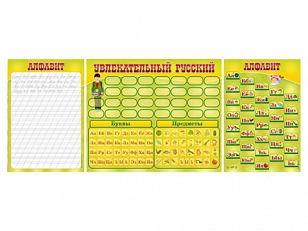 Комплект оборудования представляет собой совокупность электрифицированного стенда "Русский алфавит", тематической магнитной доски "Увлекательный русский" и маркерной доски.