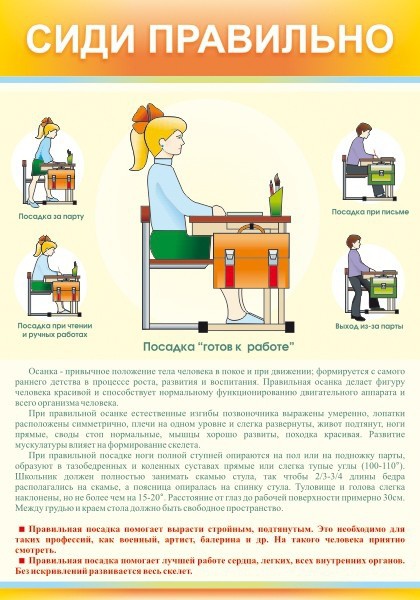 Важность правильной осанки в жизни человека, сложно было бы переоценить. И поэтому стенд на тему, связанную прямиком с правильной осанкой, для школьников начальных классов, придется очень кстати! На этом стенде присутствуют и рисунки, безупречно показывающие нужные варианты сидения за партами, и текст о том, как необходимо поддерживать правильную осанку. А красным шрифтом снизу стенда, выделены плюсы, которые можно иметь в арсенале, если следить за посадкой. И таким образом, каждый ученик сможет сравнить то, как сидит он сам, с тем, как нужно сидеть, на самом деле. Дизайн стенда понравится, даже самым строгим учителям. А школьникам, тем более.