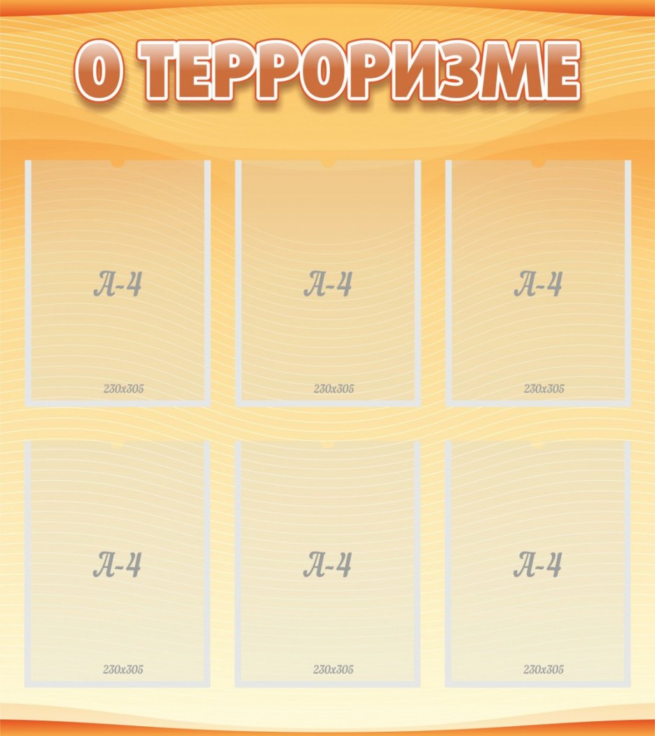 Терроризм — это не просто слово, но и информация, которой должен владеть каждый гражданин РФ. Чтобы своевременно доводить информацию о террористической угрозе населению, был разработан стенд с шестью карманами, которые дают возможность менять содержимое о различных действиях и последствиях терроризма, такой материал должен присутствовать в каждой школе, воспитывая моральный облик. Стенд «О терроризме» классифицируется как легко монтируемый, основание сделано из качественного ПВХ, которое надежно контактирует с двухсторонним скотчем и с любым другим крепежным элементом.