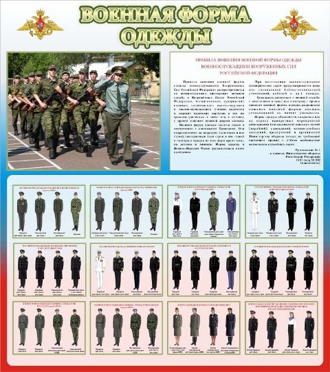 На стенде «Военная форма одежда» предоставлена вся самая важная информация, связанная с военным обмундированием. Здесь наглядно показано в какую форму должны быть одеты представители ВС РФ для того, чтобы ученики или курсанты имели полное представление об особенностях сезонной формы одежды военнослужащих. Стенд произведен из совершенно чистого материала и защищен прозрачной пленкой. На информативной площади стенда расположены яркие фотографии, показывающие все виды военного обмундирования. Стенд предназначен для расположения на стенах учебных заведениях.