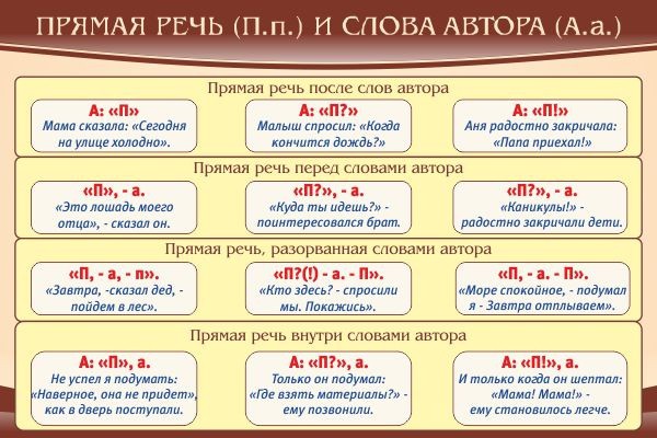В русском языке существуют исключительные правила и, чтобы все эти правила остались незабытыми у ученика, недостаточно повторять их на уроке, они так же должны и присутствовать в кабинете русского языка в виде подсказки. Для помощи ученику и учителю был разработан информационный стенд с названием «Прямая речь и слова автора» с информацией, написанной в доступной форме и хорошо понятной ученику, где ясно показано где и как ставится прямая речь и слова автора, а приведенные примеры помогут в случае какого-то недопонимания материала. Дизайн сделан таким образом, чтобы основные элементы выделялись и хорошо воспринимались.