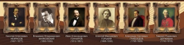 Главным долгом любого преподавателя литературы является приобщение учеников к нравственности и вовлечение в русскую поэзию, что, к сожалению, не всегда получается. Поэтому многие учителя сегодня считают правильным и даже необходимым размещение современного стенда «Великие писатели и поэты», который помогает преподавателю помочь детям понять и донести до них, что такое поэзия, кем и когда она была написана. На стенде заключены в красивые деревянные рамки, сделанные под старину, шесть из самых известных поэтов нашей страны - Некрасов Н.А, Гончаров И.А, Маяковский В.В и т. д.