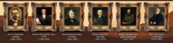 Литература — это не просто предмет школьных заведений и чтение библиотечных книг, это нравственная опора всего русского народа и жизнь многих людей. Для того, чтобы ребенок понимал, что значит литература и насколько она многогранна последнее время в кабинетах все чаще учителя стали размещать современный стенд «Великие писатели и поэты», где лица русских поэтов заставляют глубже проникнуться в русскую поэзию и, соответственно, расширить знания учеников по этому предмету. На стенде аккуратно в старинных деревянных рамочках расположены такие поэты, как Гоголь Н.В., Тютчев Ф.И., Тургенев И.С. и т.д.