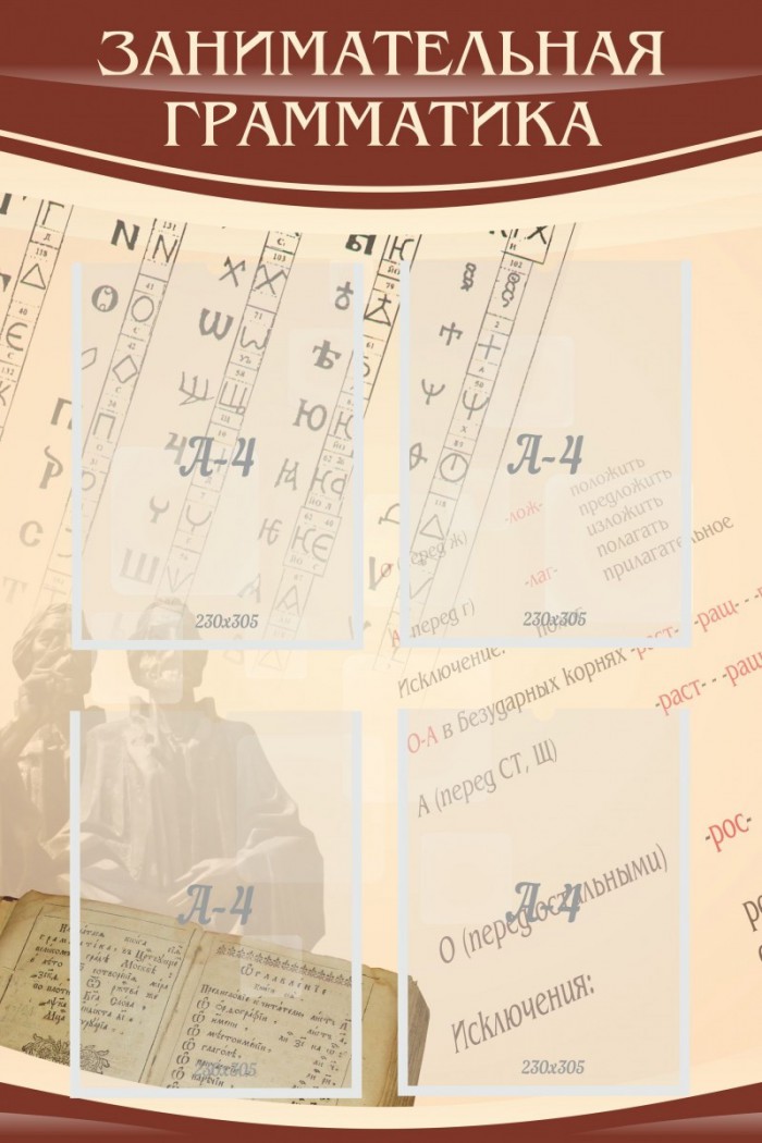 Доводя школьную программу до учеников, учителя не могут заострить внимание на какой-то определенной теме для одного школьника, в связи с чем падает общая успеваемость класса, из-за чего ученик порой пытается самостоятельно дополучить недостающий уровень знаний. Чтобы облегчить ему путь к знаниям был придуман стенд «Занимательная грамматика» с четырьмя карманами для особо важного материала по школьной программе. Стенд имеет изображение великих и известных людей, которые переносят значимость располагаемой информации на таком стенде. Основание из легкого материала позволяет закрепить его на стену самостоятельно.