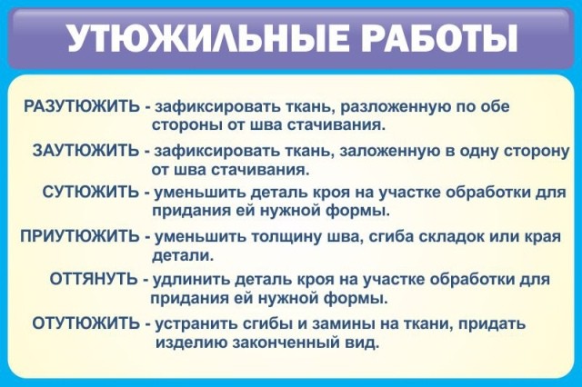 Для обучения шитью необходимо хорошо знать все утюжильные работы, что они обозначают и какими бывают. Информационный стенд «Утюжильные работы» отображает все обозначения утюжильных работ, что очень важно знать ученицам образовательных заведений. Стенд оформлен грамотно, четко, без каких-то лишних деталей, что позволяет сосредоточиться на необходимом материале. Стенд изготовлен из качественного пластика, который защищен ламинацией, увеличивающей его срок службы. Монтаж можно легко осуществить поверхность стены, используя двухсторонний скотч или небольшие саморезы.