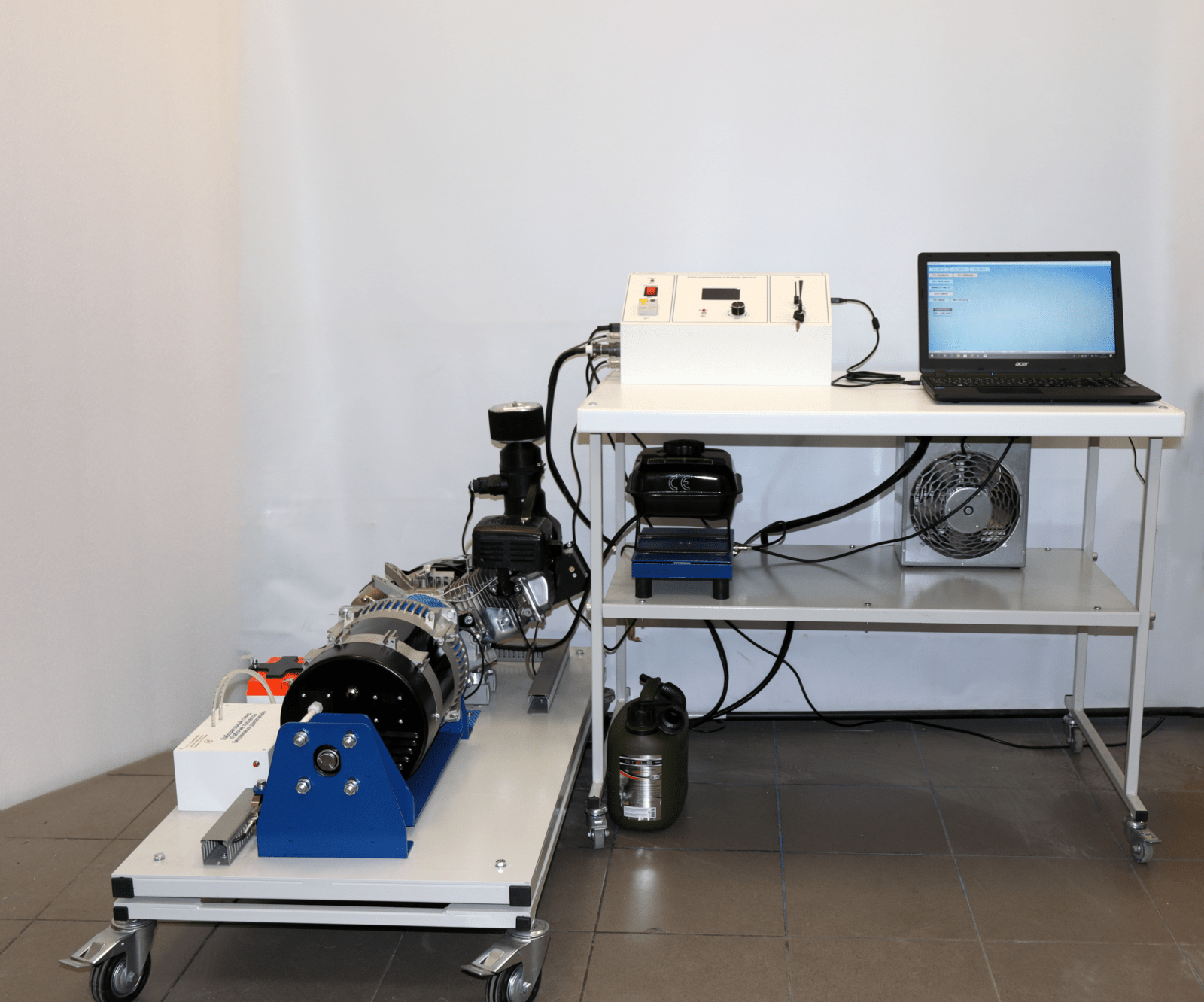 Лабораторный стенд представляет собой одноцилиндровую бензиновую установку, оснащенную генератором, и устройством управления, имеющим возможность передачи данных и управления с персонального компьютера. Двигатель оборудован датчиками, в том числе и датчиком крутящего момента.
