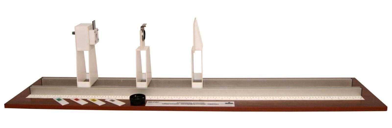 Комплект состоит из установка источника белого света с регулируемым источником питания, сетки, собирательной линзы и экрана с миллиметровой шкалой в виде креста, устанавливаемых в рейтерах на оптической скамье. На боковой поверхности скамьи нанесена миллиметровая шкала. В комплект входит набор, позволяющий изучать