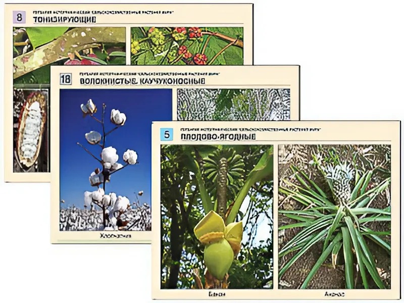 Пособие состоит из 18 полноцветных листов, напечатанных на картоне и ламинированных матовой (антибликовой) пленкой. Представлено 36 фотографий сельскохозяйственных культур: зерновых, сахароносных, плодовых, тонизирующих, масличных, орехоплодных, крахмалоносных, пряных, волокнистых и каучуконосных.