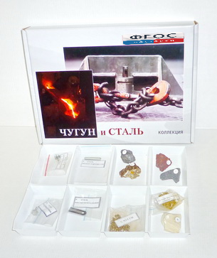 В коллекции представлены основные руды чёрных металлов, флюсы, топливо для доменного процесса, работа чугуна, стали, стальные изделия. Коллекция сопровождается описанием образцов коллекции и их назначением, а также дан дом рисунок в разрезе, что дает возможность учащимся представить работу по чугуну, полученному в доменном процессе.