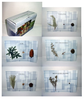 В коллекции представлены 5 видов голосеменных растений (сосна обыкновенная, кипарис, лиственница, ель, можжевельник) в виде натуральных объектов – ветки, семена, шишки (кроме ветки ели), наклеенных на планшеты, с обратной стороны планшетов есть картинки и пояснительный текст к данному растению. Наиболее целесообразно использовать коллекцию в качестве раздаточного материала, предложив учащимся следующие задания: рассмотрите внешнее строение побегов; рассмотрите строение шишек; рассмотрите семена; в чем различие и сходство побегов, шишек, семян; как распространяются семена этих растений; как семена расположены в шишках. Коллекция может быть использована в курсе природоведения и географии при изучении различных природных зон.