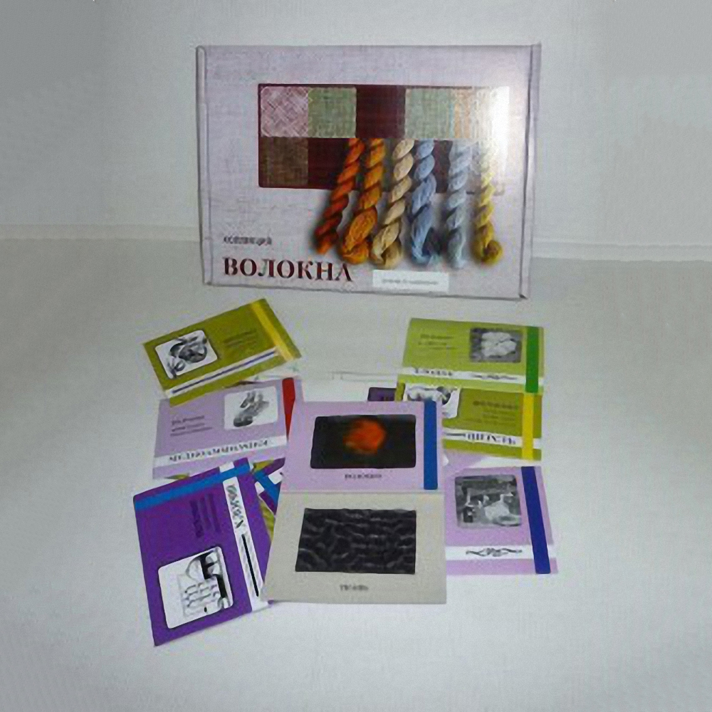 В коллекции представлены 10 образцов волокон и тканей, смонтированных на картонных паспарту. Волокна и такни по составу: натуральные (растительного и животного происхождения), искусственные, синтетические, химические. Паспарту уложены в складную коробку. Коробка упакована в прозрачную термоусадочную плёнку. На коробке печатным способом нанесено: - наименование коллекции; - наименование предприятия- изготовителя и его адрес.