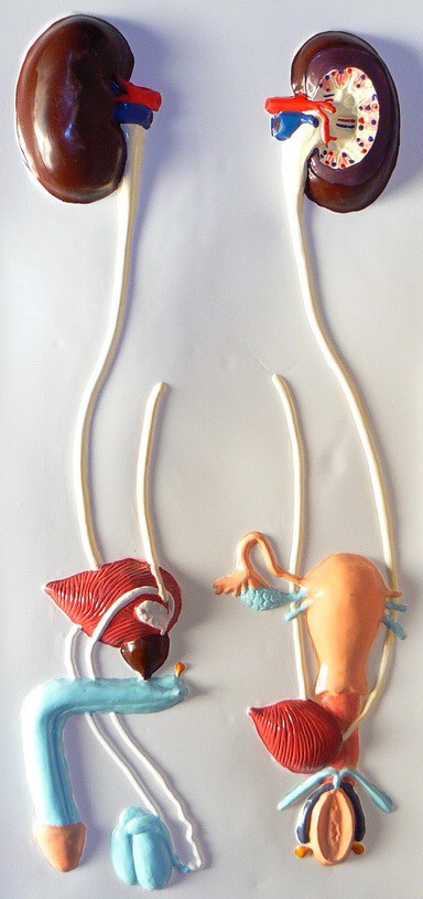 Модель изготовлена из пластмассы путем вакуумного формования. Изображает мочевыделительную систему человека (мужчины и женщины). На модели можно рассмотреть следующие органы мочевыделительной системы: