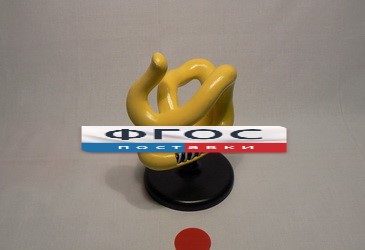 Модель представляет собой увеличенную молекулу белка из группы глобулинов. Модель отображает третичную структуру белка – глобулу, в виде толстого жгута, скрученного в клубок. Небольшая часть жгута, имитирующего нить аминокислот, вырезана. На этом участке можно рассмотреть вторичную структуру белка в виде спирали. Между витками вставлен округлый диск красного цвета - гем. Высота модели не менее 23 см.