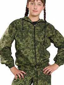 Костюм состоит из куртки и брюк. Куртка укороченная с капюшоном, центральной застежкой на тесьму-молнию, рукав втачной по низу стянут эластичной тесьмой. Низ куртки стянут на эластичную тесьму. Брюки прямые на поясе стянуты эластичной тесьмой. Выполнен из облегченной х/б ткани, упакован в компактную сумочку из аналогичной ткани. ГОСТ 25295-2003